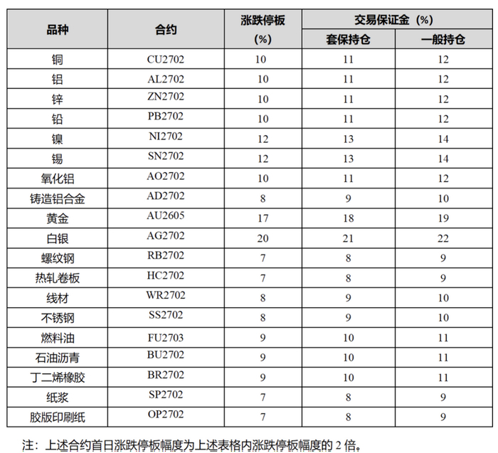 另外,19个期货品种的新上市2702合约的涨跌停板幅度和交易保证金比例也有所调整。