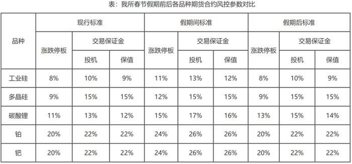 同样是周四结算时起进行调整,广期所旗下品种调整中,工业硅、多晶硅的涨跌停板在假期间上调3个百分点,碳酸锂、铂、钯的涨跌停板则是上调4个百分点。假期后,除了碳酸锂以外,其余品种的涨跌停板恢复至原有水平。