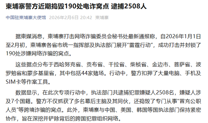 2月6日,中国驻柬大使馆曾发布消息称,自1月1日至2月初,柬埔寨警方捣毁190处电诈窝点,逮捕2508人。