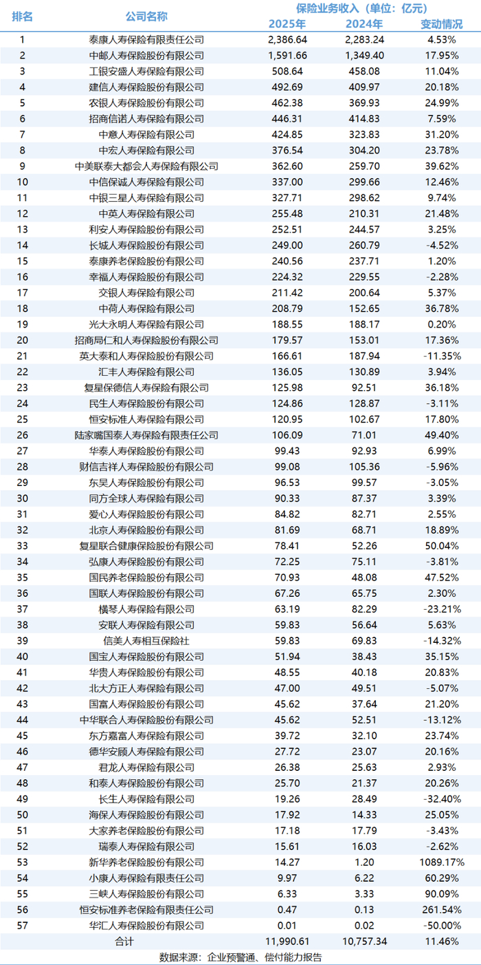 2025年,尽管面临预定利率下调和“报行合一”的深化执行,非上市寿险公司的保费收入依然保持了较强的韧性。已披露数据的57家非上市寿险公司保险业务收入合计11990.61亿元,较2024年同期的10757.34亿元增长11.46%。