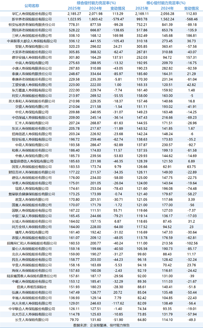 虽然2025年数据显示,行业整体偿付能力充足率保持在较高水平,绝大多数险企远高于监管红线,风险缓冲区充足。但绝大多数险企的偿付能力充足率较2024年出现下滑。