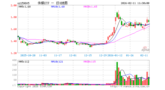 2月11日,截止午间收盘,传媒ETF(159805)跌2.05%,报1.721元,成交额2.18亿元。传媒ETF(159805)重仓股方面,分众传媒截止午盘跌0.27%,巨人网络涨1.82%,岩山科技涨0.30%,蓝色光标跌3.87%,恺英网络涨7.00%,利欧股份跌0.12%,昆仑万维跌3.95%,三七互娱跌0.04%,光线传媒涨7.55%,神州泰岳跌0.64%。