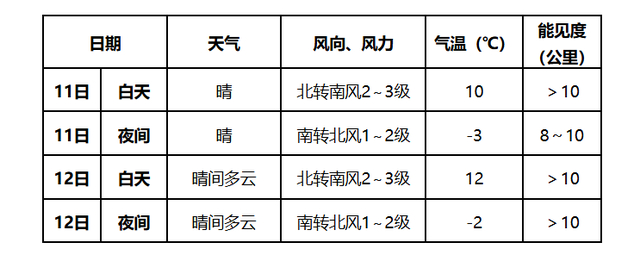 预计11日天气晴,白天风力2~3级,最高气温10℃;夜间风力1~2级,最低气温-3℃。12日天气为晴间多云,风力不大,白天最高气温12℃,夜间最低气温-2℃。