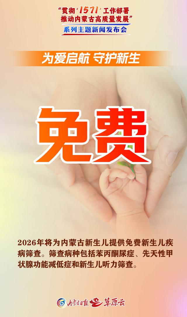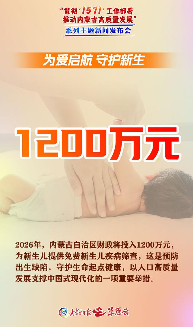 2月11日,记者从内蒙古自治区政府新闻“贯彻‘1571’工作部署 推动内蒙古高质量发展”系列主题新闻发布会了解到,2026年内蒙古将投入1200万元,为新生儿提供免费疾病筛查。