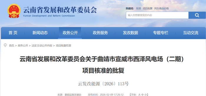一、西泽风电场(二期)项目已列入《云南省2024年第二批新能源项目开发建设方案》(云能源新能〔2024〕194号),项目建设符合云南省新能源实施计划。为有效利用当地风能资源,提高区域供电能力,依据《云南省人民政府关于印发云南省企业投资项目核准和备案实施办法的通知》(云政规〔2023〕2号)、《云南省发展和改革委员会关于印发规范风电项目核准管理有关事项的通知》(云发改能源规〔2023〕2号)等有关文件规定,同意建设西泽风电场(二期)项目(项目代码:2503-530381-04-01-849416)。项目单位为国电电力云南新能源开发有限公司。