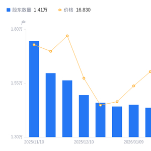 2月11日消息,数据显示,截至2026年2月10日,建科院A股股东总户数为1.41万户,较上期(2026年1月30日)减少23户,降幅0.16%。公司最新A股总股本为1.47亿股,其中流通A股1.47亿股,户均持有流通A股数量为1.04万股,较上期增加16.83股,增幅0.16%;户均持流通A股市值17.45万元,较上期增加3802.67元,增幅2.23%。