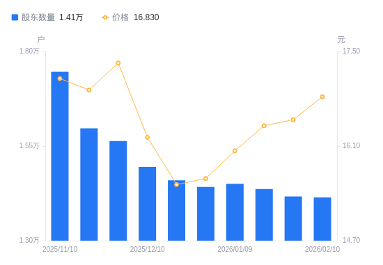 近一年(2025年2月10日至2026年2月10日),建科院A股股东户数从1.73万户,减低至1.41万户,降幅18.46%,区间股价上涨13.10%。