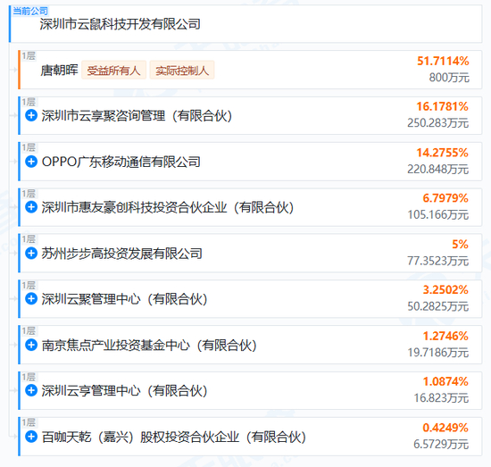 天眼查显示,OPPO广东移动通信为云鼠科技第三大股东,持股14.2755%;苏州步步高为持股5%的第五大股东。