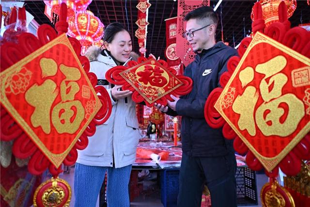 2月11日,呼和浩特市民在保全庄农贸市场选购春联、福字等节庆饰品。
