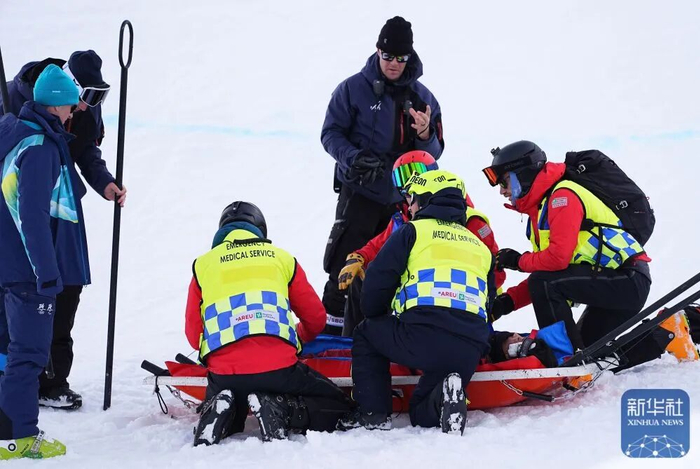 医务人员第一时间进场检查,随后救援队员用雪橇将刘佳宇送入场地医疗室。记者向医务人员初步了解到,刘佳宇系头部磕碰,目前意识清醒。