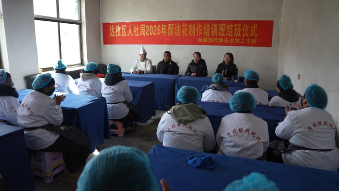 春临高原,年味渐浓。近日,拉萨市达孜区章多乡尊木采村暖意融融,由达孜区人社局主办、西藏现代服务业技工学校承办的酥油花制作技能培训班考核鉴定结业典礼举行。20名参训农牧民带着30天勤学苦练的成果,用一朵朵色彩斑斓、造型精巧的酥油花,交出了脱贫增收与文化传承的双重答卷。