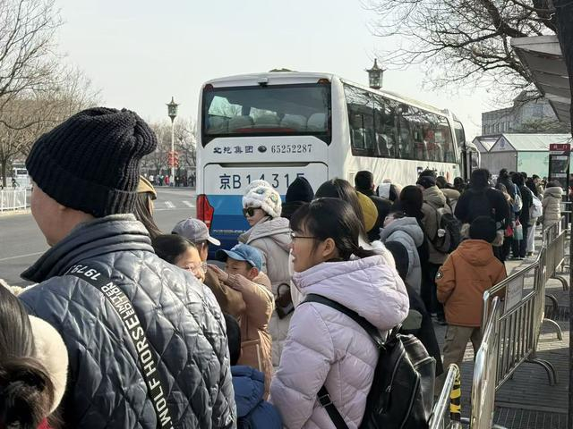 2月9日一大早,前门大街东西两侧的公交车站挤满了游客,他们都在等着乘坐大巴车去游览八达岭长城、慕田峪长城。记者在现场看到,队伍中不乏老人和孩子的身影,老人一脸疲惫,孩子喊困喊冷。
