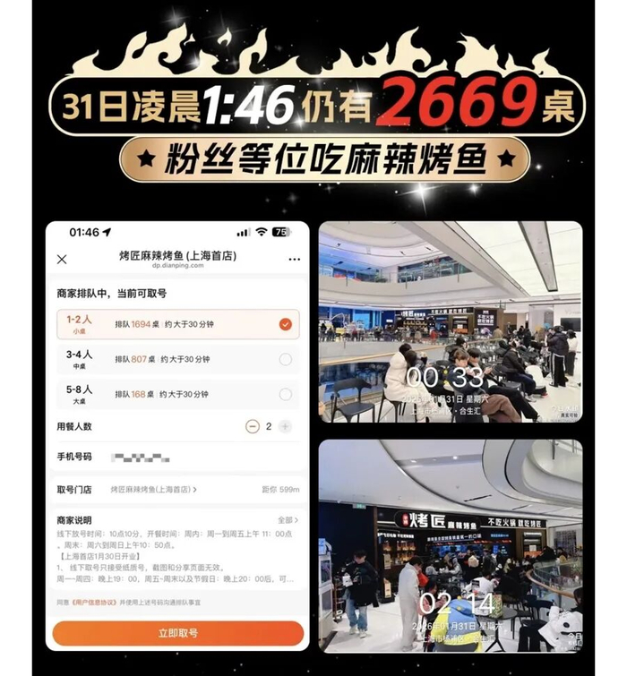 烤匠上海首店开业后,有消费者在小红书发文称:“区区十个半小时,一边吃一边犯困”,配以一张在店内吃烤鱼的照片。略显抱怨的语气,带些炫耀的小心思,短时间收获上百个赞和三百多条评论。有人拍下合生汇开业后客人激情冲向取号台的场面,有人玩梗“一代人有一代人的鸡蛋要抢”……