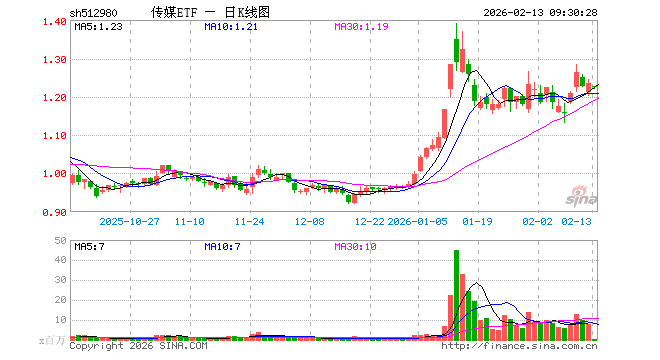 2月13日,传媒ETF(512980)开盘跌0.73%,报1.226元。传媒ETF(512980)重仓股方面,分众传媒开盘跌0.27%,巨人网络跌0.56%,蓝色光标跌1.29%,岩山科技跌2.26%,恺英网络跌0.43%,利欧股份跌0.88%,昆仑万维跌3.19%,三七互娱跌0.69%,光线传媒涨1.31%,神州泰岳跌0.72%。