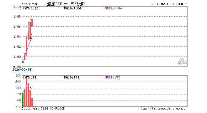 2月13日,截止午间收盘,船舶ETF(560710)涨0.56%,报1.074元,成交额8790.66万元。船舶ETF(560710)重仓股方面,中国动力截止午盘跌0.44%,中国船舶涨1.66%,中船防务涨2.59%,天海防务涨4.26%,中船科技涨0.92%,振华重工跌0.58%,潍柴重机跌2.65%,中国海防涨1.51%,亚星锚链涨10.04%,久之洋涨4.14%。