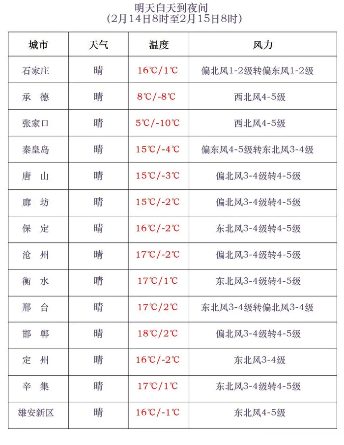 15-16日早晨,北部和东部地区最低气温下降5~8℃,其中张家口北部和承德坝上地区下降9~11℃,其他地区最低气温下降2~4℃。
