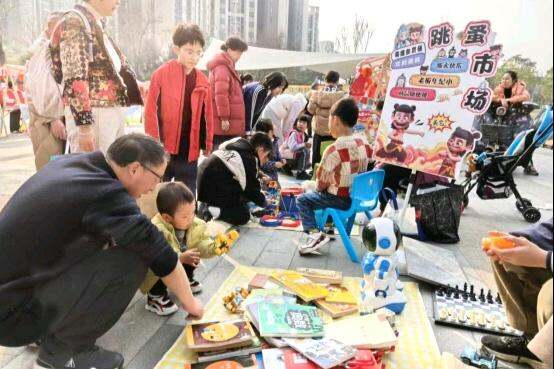 如果说传统庙会留住了年俗的“根”,临江社区的迎春集市则开出了治理创新的“花”。2月6日,“欢迎光‘临’·‘江’有好市”之“岁末迎新·吉市满堂”主题集市在朗诗西侧公园广场鸣锣开市。匠人手作与商家展示相映成趣,剪纸窗花与手写春联各擅胜场;邻里闲置置换区,孩子们抱着闲置绘本、玩具前来“摆摊”,在交换中读懂分享。马年游戏互动区,马上捶丸、蒙眼击“马”福、飞马吸福气三个关卡人气高涨,闯关集章的欢笑声此起彼伏。