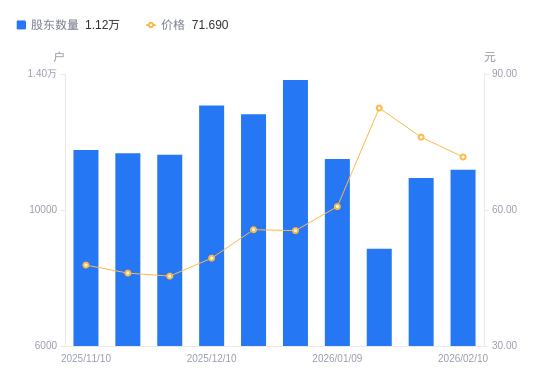 近一年(2025年2月20日至2026年2月10日),宏盛股份A股股东户数从9295户,增加至1.12万户,增幅20.33%,区间股价上涨263.36%。