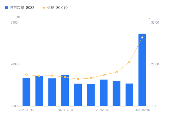 近一年(2025年3月31日至2026年2月10日),欧莱新材A股股东户数从6319户,增加至8032户,增幅27.11%,区间股价上涨68.98%。