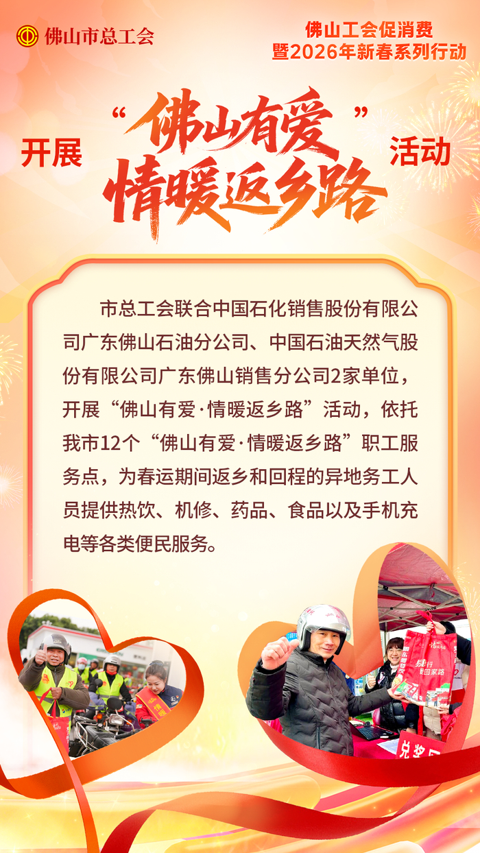 春运路上,温暖从不缺席。今年春节,市总工会联合中国石化销售股份有限公司广东佛山石油分公司、中国石油天然气股份有限公司广东佛山销售分公司2家单位,在全市主要交通要道设立12个“佛山有爱·情暖返乡路”职工服务点,为返乡回程的异地务工人员提供热饮、机修、药品、食品、手机充电等便民服务。