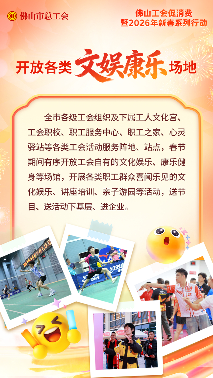 这个春节,不打烊的不只是服务,还有满满的快乐。全市各级工会组织及下属工人文化宫、工会职校、职工服务中心、职工之家、心灵驿站等各类工会活动阵地,有序开放文娱康乐场馆。送节目、送活动下基层、进企业,讲座培训、亲子游园、文体竞赛轮番上演,让你在佛山喜悦过大年。