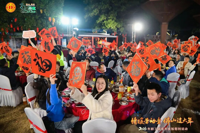 “新春快乐,马年大吉,干杯!”一连三场的职工新春年夜饭,工会团年盆菜热气腾腾端上桌,来自各行各业的佛山职工围坐一堂,举杯相庆,笑语盈盈。