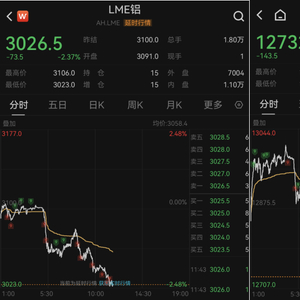 北京时间2月13日午后,伦铝、伦铜期货价格直线跳水,伦铝迅速由涨转跌,随后跌幅持续扩大,截至19:40,跌幅达2.37%;伦铜由涨超1%跳水、翻绿,现跌1.11%。