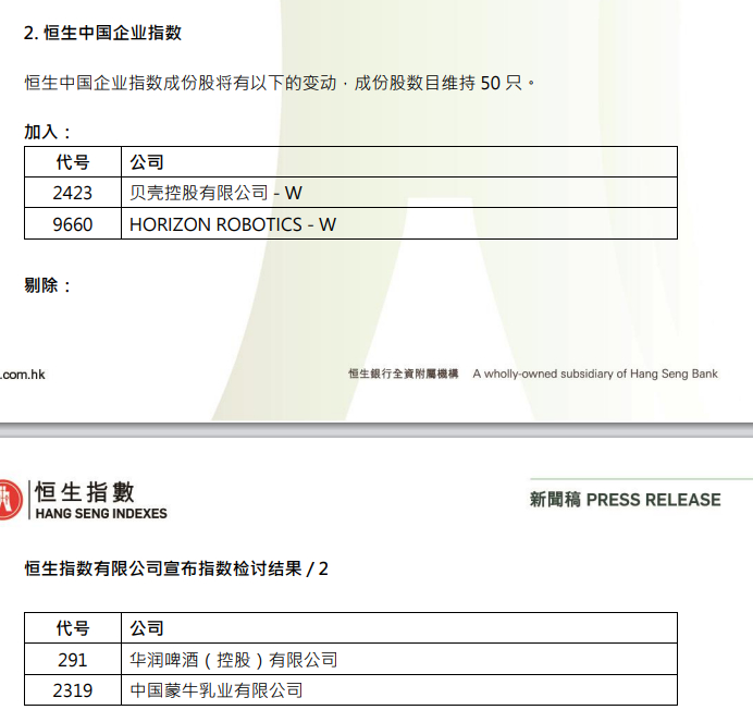 恒生中国企业指数方面,成份股数目将维持50只,将加入贝壳-W(02423)和地平线机器人-W(09660)2只股票,同时将剔除华润啤酒(00291)和蒙牛乳业(02319)2只股票。