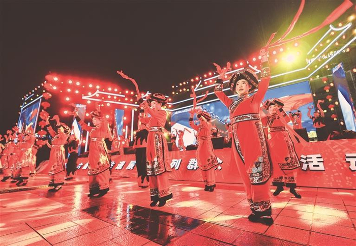 春节临近,2026年六盘水市非遗展演系列群众文化活动在钟山区拉开帷幕。活动通过文艺演出、互动体验、非遗展示等多元形式,丰富春节群众精神文化生活,营造喜庆祥和新春氛围。图为彝族铃铛舞表演。 贵州日报天眼新闻记者 郭立 摄