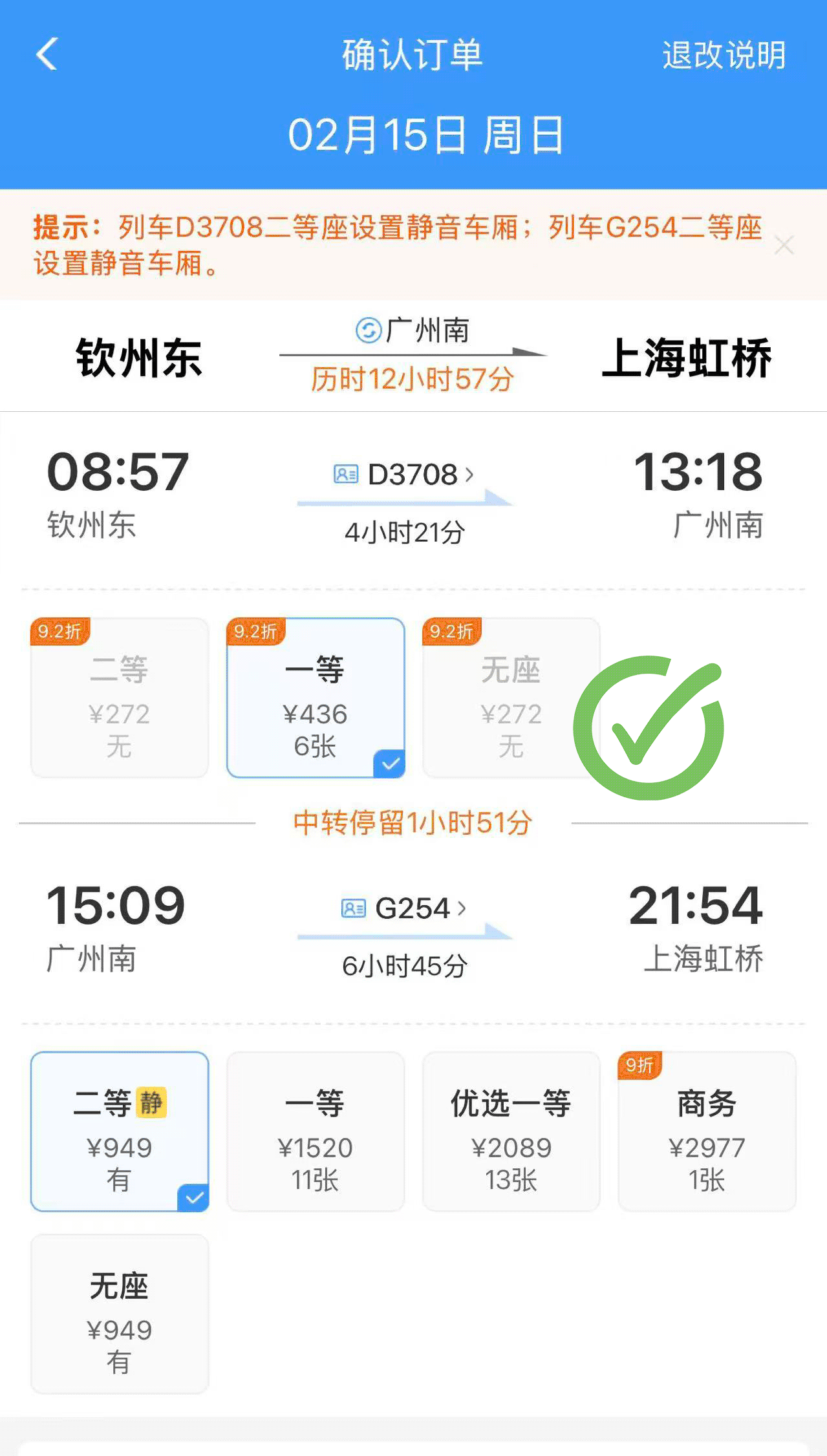 2月20日至21日G4945次南京南至贵阳北二等座打2.7折、全程244元