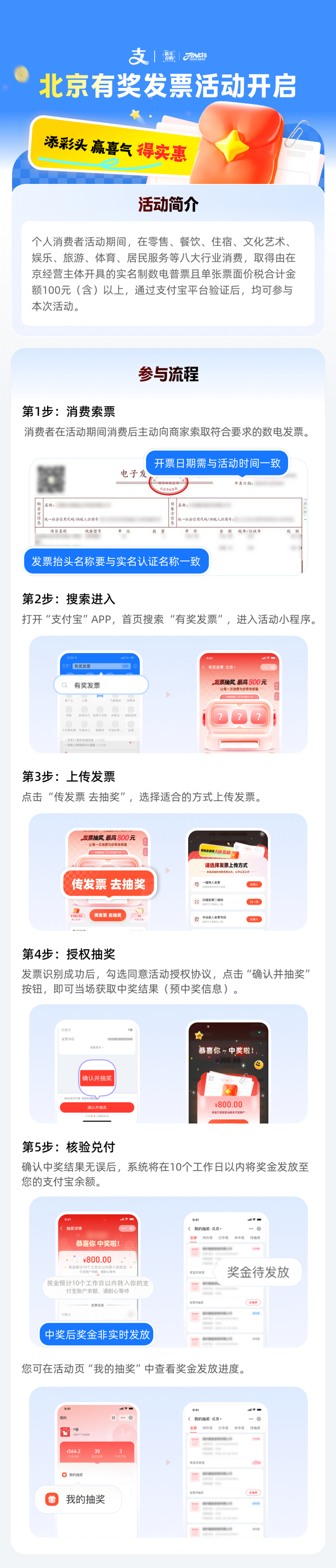 具体参与抽奖入口,请关注当地官方发布内容。以北京为例,可通过京东、云闪付、微信、支付宝等平台参与。京东作为第一波接入政策的电商平台,2月10日起也全面接入有奖发票抽奖服务,目前已覆盖北京、上海、武汉等12个城市。