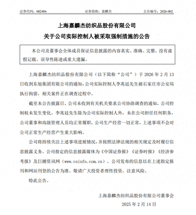 财联社2月14日讯(编辑 沈超)2月13日晚间,上海嘉麟杰纺织品股份有限公司(嘉麟杰,002486.SZ)公告称,公司于2026年2月13日收到东旭集团有限公司的通知,公司实际控制人李兆廷被石家庄市公安局执行拘留,相关案件正在调查过程中。