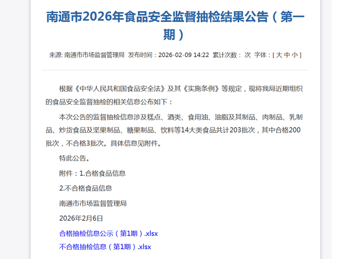 江苏省南通市2026年食品安全监督抽检结果公告(第一期)