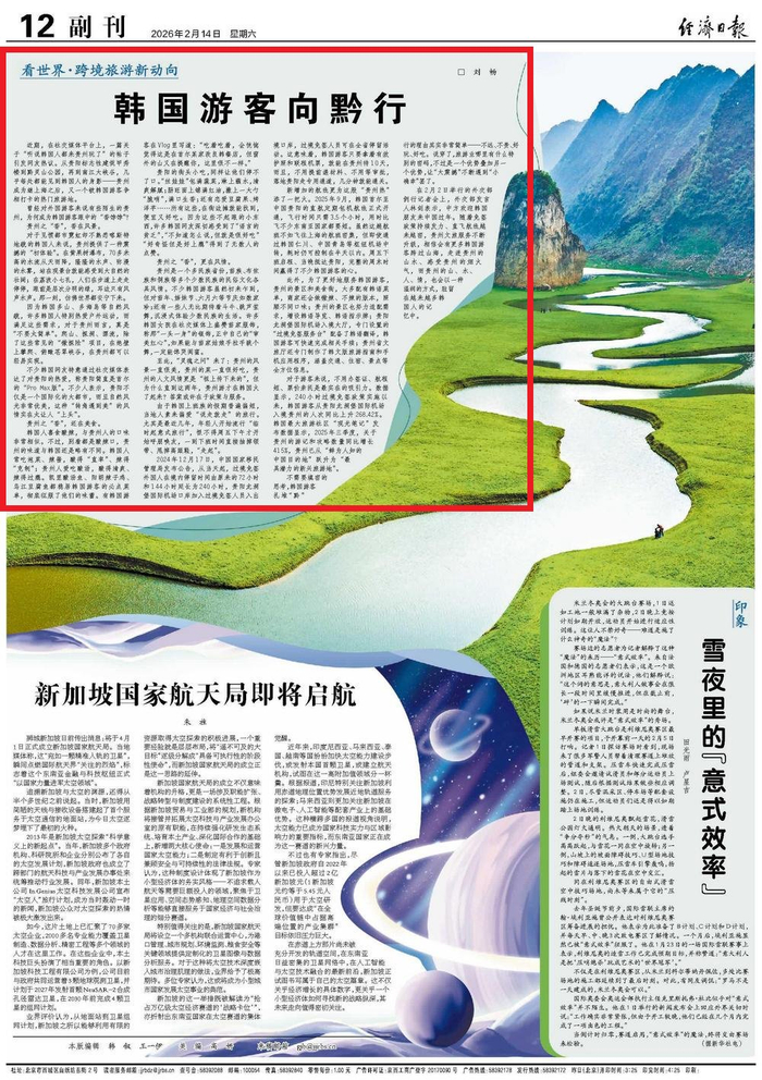 在2月2日举行的外交部例行记者会上,外交部发言人林剑表示,中方欢迎韩国朋友来中国过年。随着免签政策持续发力、直飞航线越来越密,贵州文旅服务不断升级,相信会有更多韩国游客跨过山海,走进贵州的山水、感受贵州的烟火气,而贵州的山、水、人、情,也会以一种温润的方式,驻留在越来越多韩国人的记忆中。