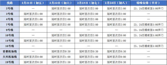 目前,“八站两场”已实现地铁接驳全覆盖,高峰时段旅客通行和换乘效率大幅提升。为进一步提升场站接驳能力,在假期客流高峰日,共有9条地铁线路成环组网延长运营时间,5条线路提前开门运营,全力覆盖夜间到站及早间返程旅客出行需求。其中,地铁2号线,22日至24日延时运营至次日2:00;地铁7号线,21日延时运营至次日1:00,22日至24日延时运营至次日2:00;地铁4号线、14号线,21日延时运营至次日1:00,22日、23日延时运营至次日2:00,24日延时运营至次日1:00;地铁3号线,21日延时运营至次日1:00,22日、23日、24日延时运营至次日2:00;地铁10号线,22日、23日延时运营至次日2:00,24日延时运营至次日0:00;地铁首都机场线,22日至24日延时运营至次日0:30;21日、24日地铁大兴机场线延长运营时间至次日0:00、19号线联动延至次日0:30,22日、23日地铁大兴机场线延长运营时间至次日1:00、19号线联动延至次日1:30,覆盖北京站、北京西站、北京南站、朝阳站、丰台站及两大机场,保障夜间到站旅客顺畅衔接。同时,2号线、7号线、9号线、10号线、16号线于23日、24日提前至5:00开门运营,满足早间返程出行需求。