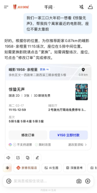 据悉,千问是全世界第一个实现用语音买电影票的AI助手。只需打开千问APP,说一句"我们一家三口想看大年初一的惊蛰无声,帮我找个离家最近的电影院,座位不要太靠前。"千问就会自动选好电影院、场次和座位,并生成订单,用户点击付款就可出票,全过程只需要十几秒。