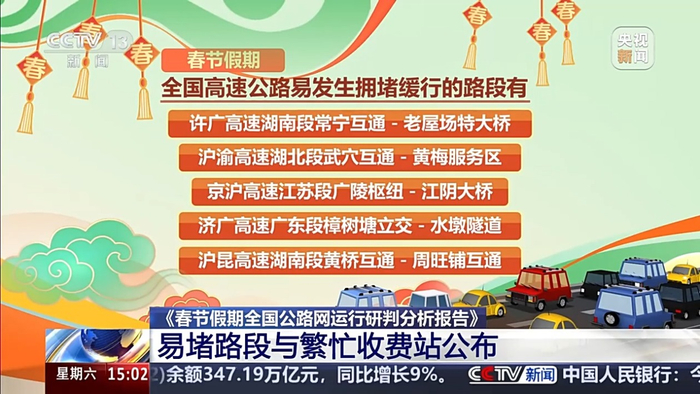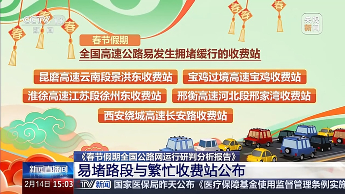 《春节假期全国高速公路路网运行研判分析报告》还发布了春节假期全国高速公路易发生拥堵缓行的路段和收费站。