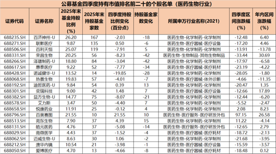 从公募基金四季度对科创板的调仓来看,医药生物板块仍是其结构性加仓的重要方向。在持股比例(流通股)增持幅度排名前二十的公司中,该板块强势占据六席。