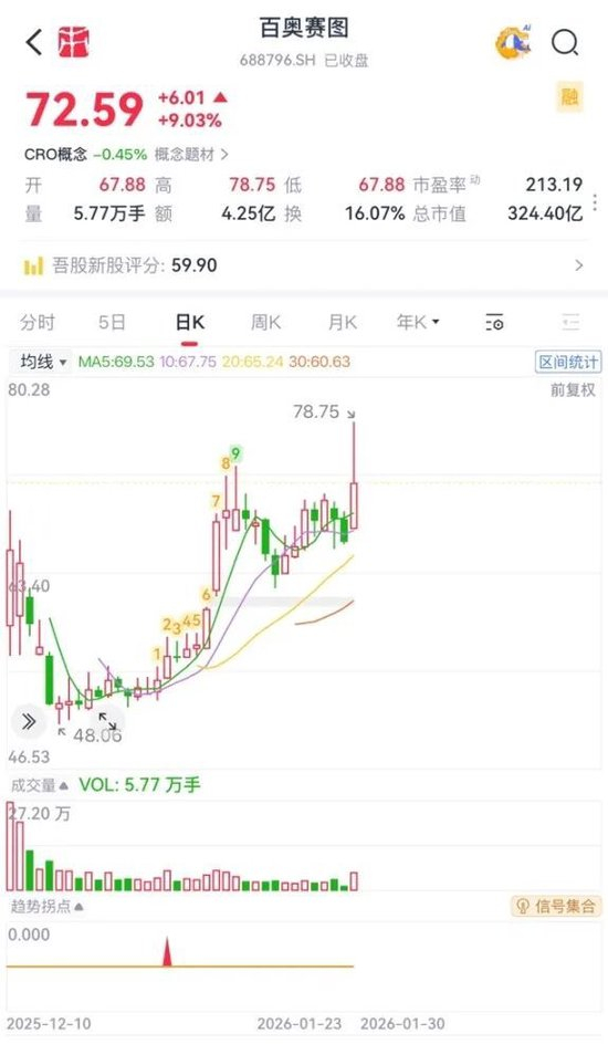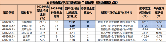 其中,2025年11月上市的百奥赛图受到公募基金追捧,去年末有10家公司持有,持有比例已高达21.5%。这只新股自上市以来股价走势强劲,四季度接近翻倍,1月份再涨26.5%。