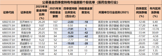 但四季度,前五家公司无一例外地面临公募基金的减持潮,且减持比例均较为显著。其中,百利天恒持股比例下降7.9个百分点,荣昌生物减少8个百分点,诺诚健华的减持幅度最高,接近20个百分点。