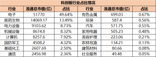 截至1月29日,科创板上市公司的合计流通市值为10.4万亿,涉及16个行业。