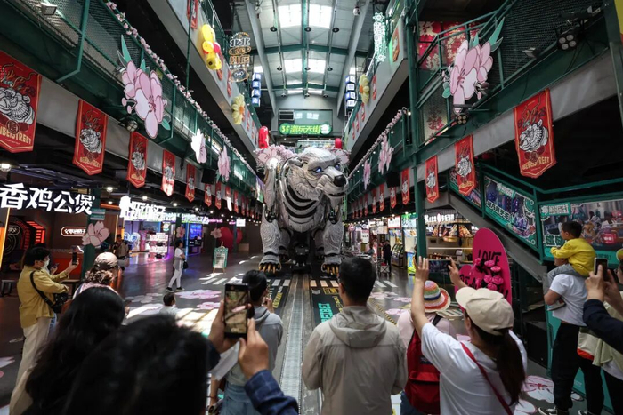 游客在辽宁省大连市熊洞街观看仿生机械巨熊表演/新华社记者潘昱龙 摄