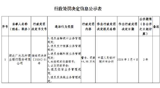 湖北广水农村商业银行被罚44.98万元:违反金融统计业务管理规定等