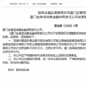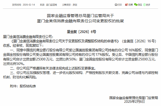 2月14日金融一线消息,国家金融监督管理总局厦门监管局今日发布《关于厦门金美信消费金融有限责任公司变更股权的批复》,同意中国信托商业银行股份有限公司受让国美控股集团有限公司持有的金美信消金16%股权,同意厦门金圆金控股份有限公司受让国美控股集团有限公司持有的金美信消金17%股权。