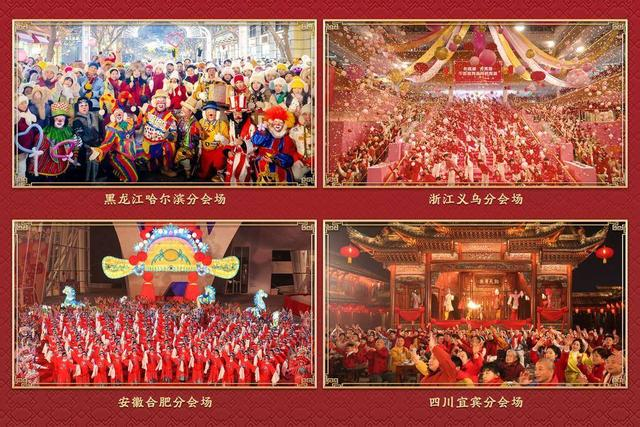 四地分会场以热烈的情绪和各具特色的表达,将神州大地的活力四射铺展成宽广的新年图景。观众置身于黑龙江哈尔滨分会场,尽享冰天雪地里的火热中国年;在浙江义乌分会场中外交融的歌舞中感受到各美其美、美美与共的氛围;安徽合肥分会场的黄梅戏与水墨丹青为观众带来一幅“皖”美画卷;四川宜宾分会场的热辣滚烫与非遗元素抒发策马扬鞭、勇往直前的奋进精神。