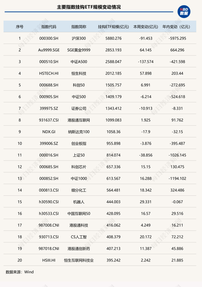 从年内变动来看,沪深300指数挂钩ETF规模缩水额高达5975.29亿元,最新规模为5880.28亿元,较年初规模已经“腰斩”;此外,中证1000、上证50指数挂钩ETF规模年内缩水额也超1000亿元,分别为1194.1亿元、1026.14亿元。另一方面,SGE黄金9999、细分化工、恒生科技和科创芯片指数挂钩ETF年内规模增长均超100亿元,分别为664.3亿元、324.49亿元、203.44亿元和130.47亿元。