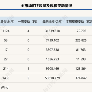 本周上市ETF终于结束持续缩水势头,一周增加374.84亿元,全市场ETF总规模回升至5.36万亿元,其中债券型ETF、跨境ETF功不可没。数量方面,Wind数据显示,截至2月14日,本周新增5只ETF,其中股票型ETF为4只,剩余1只为跨境ETF;至此,上市ETF总数量达1435只。