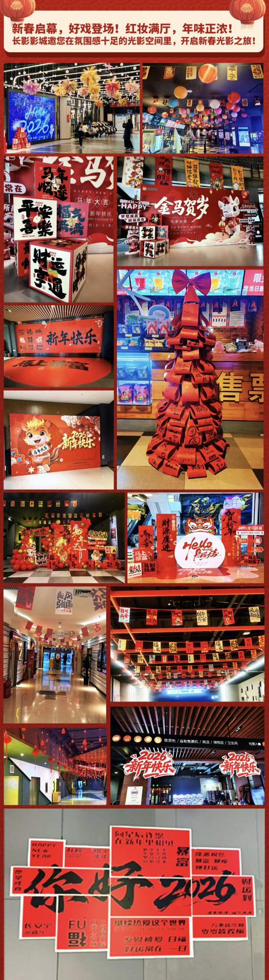 长影影城依托电影文化底蕴,打造观影与文化体验融合场景。春节期间推出会员双倍积分、满额抽奖、跨界消费折扣等活动,完成巨幕厅与主题影厅音画、座椅升级。大厅红灯笼高悬,马年主题美陈与老电影文化展墙相映成趣,文化氛围与年味十足。