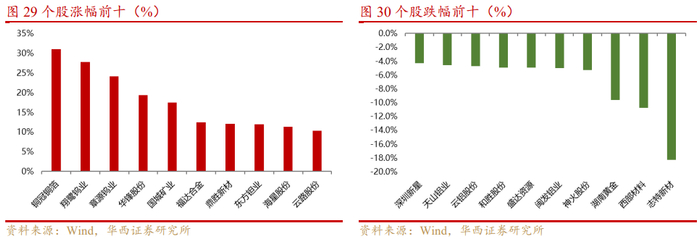 基本金属、贵金属、除稀土外的小金属、除磁材外的金属新材料的上市公司中,周涨幅前五分别是西部材料、鑫铂股份、东方钽业、翔鹭钨业、章源钨业,涨幅分别为12.19%、10.91%、10.08%、8.96%、8.03%。周跌幅前五分别是湖南白银、白银有色、豫光金铅、盛达资源、兴业银锡,跌幅分别为32.56%、29.77%、27.75%、22.07%、21.94%。
