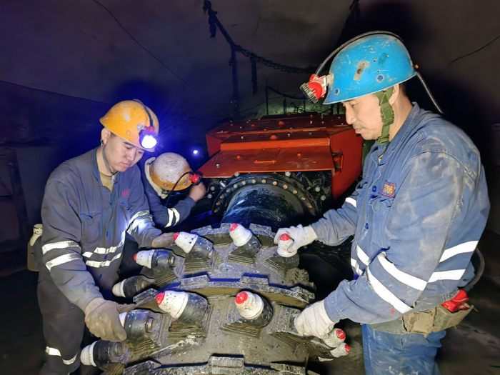 老虎台矿680米深处运输煤门第五掘进工作面,工人们正在调试刚组装好的新型悬臂式掘进机。